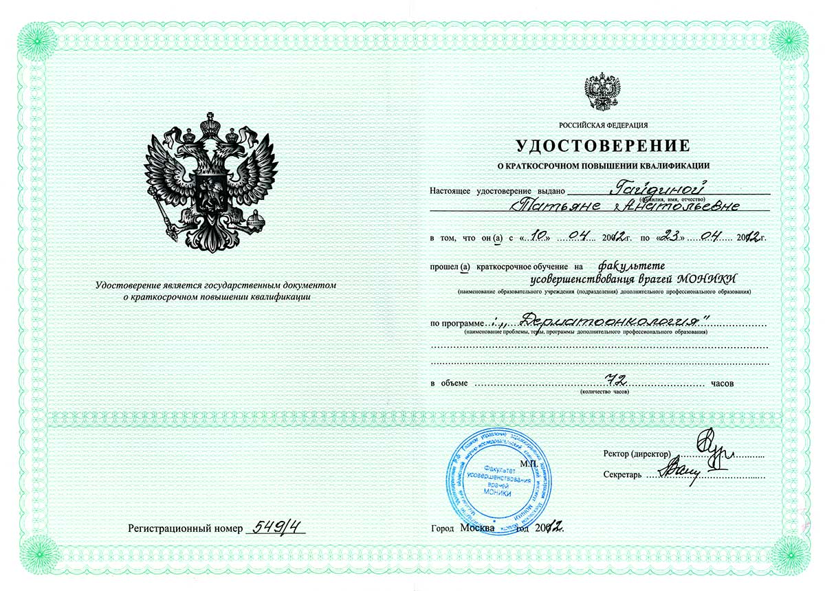 2012 - Повышение квалификации на базе факультета усовершенствования врачей ГУ МОНИКИ им. М.Ф. Владимировского, по специальности: дерматовенерология.